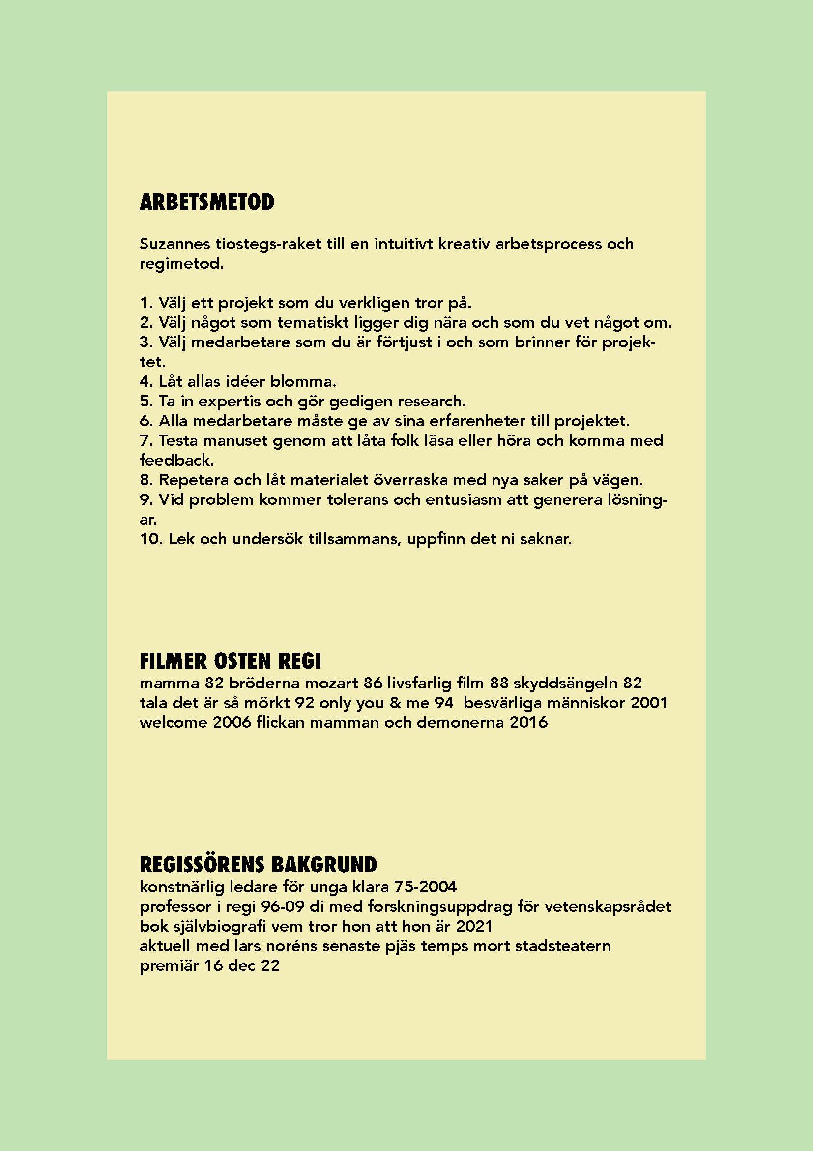 Seminariet inleds med en intervju mellan moderator Erik Blix och regissören, författaren och dramatikern Suzanne Osten: barnteaterpionjären som ägnat nästan ett helt liv åt barns reaktioner på dramatiska händelser och som blivit världsberömd för sitt arbete för en ung publik.